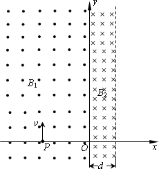 如圖所示的坐標(biāo)平面內(nèi),在y軸的左側(cè)存在垂直紙面向外、磁感應(yīng)強(qiáng)度大小B1=0.20 T的勻強(qiáng)磁場,在y軸的右側(cè)存在垂直紙面向里、寬度d=12.5 cm的勻強(qiáng)磁場B2.某時(shí)刻一質(zhì)量m=2.0×10-8 kg、電量q=+4.0×10-4 C的帶電微粒(重力可忽略不計(jì)),從x軸上坐標(biāo)為(-0.25 m,0)的P點(diǎn)以速度v=2.0×103 m/s沿y軸正方向運(yùn)動(dòng).試求:
