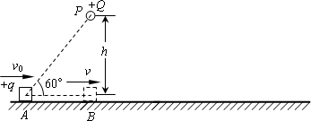 如圖所示,在足夠長的光滑絕緣水平直線軌道上方h高度的P點(diǎn),固定電荷量為+Q的點(diǎn)電荷.一質(zhì)量為m、電荷量為+q的物塊(可視為質(zhì)點(diǎn)),從軌道上的A點(diǎn)以初速度v0沿軌道向右運(yùn)動(dòng),當(dāng)運(yùn)動(dòng)到P點(diǎn)正下方B點(diǎn)時(shí)速度為v.已知點(diǎn)電荷產(chǎn)生的電場在A點(diǎn)的電勢為φ(取無窮遠(yuǎn)處電勢為零),PA連線與水平軌道的夾角為60°.試求: