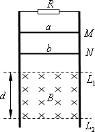 如圖所示,電阻忽略不計的、兩根兩平行的光滑金屬導軌豎直放置,其上端接一阻值為3 Ω的定值電阻R.在水平虛線L1、L2間有一與導軌所在平面垂直的勻強磁場B,磁場區(qū)域的高度為d=0.5 m.導體棒a的質(zhì)量ma=0.2 kg、電阻Ra=3 Ω;導體棒b的質(zhì)量mb=0.1 kg、電阻Rb=6 Ω,它們分別從圖中M、N處同時由靜止開始在導軌上無摩擦向下滑動,且都能勻速穿過磁場區(qū)域,當b剛穿出磁場時a正好進入磁場.設(shè)重力加速度為g=10 m/s2.(不計a、b之間的作用)求:
