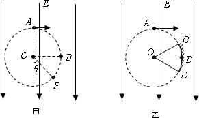 如圖甲所示,在場(chǎng)強(qiáng)大小為E、方向豎直向下的勻強(qiáng)電場(chǎng)內(nèi)存在一個(gè)半徑為R的圓形區(qū)域,O點(diǎn)為該圓形區(qū)域的圓心,A點(diǎn)是圓形區(qū)域的最高點(diǎn),B點(diǎn)是圓形區(qū)域最右側(cè)的點(diǎn).在A點(diǎn)由放射源釋放出初速度大小不同、方向均垂直于場(chǎng)強(qiáng)向右的正電荷,電荷的質(zhì)量為m,電量為q,不計(jì)電荷的重力.