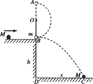 如圖所示,O點為固定轉(zhuǎn)軸,把一個長度為l的細(xì)繩上端固定在O點,細(xì)繩下端系一個質(zhì)量為m的小擺球,當(dāng)小擺球處于靜止?fàn)顟B(tài)時恰好與平臺的右端點B點接觸,但無壓力.一個質(zhì)量為M的小鋼球沿著光滑的平臺自左向右運動到B點時與靜止的小擺球m發(fā)生正碰,碰撞后擺球在繩的約束下作圓周運動,且恰好能夠經(jīng)過最高點A,而小鋼球M做平拋運動落在水平地面上的C點.測得B、C兩點間的水平距離DC=x,平臺的高度為h,不計空氣阻力,本地的重力加速度為g,請計算: