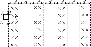 B=1 T,每一條形磁場區(qū)域的寬度及相鄰條形磁場區(qū)域的間距均為d=0.5 m,現(xiàn)有一邊長l=0.2 m、質量m=0.1 kg、電阻R=0.1 Ω的正方形線框MNOP以v0=7 m/s的初速從左側磁場邊緣水平進入磁場,求:(1)線框MN邊剛進入磁場時受到安培力的大小F;