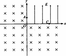Oxy的第一象限中存在沿y軸正方向的勻速磁場(chǎng),場(chǎng)強(qiáng)大小為E.在其它象限中存在勻強(qiáng)磁場(chǎng),磁場(chǎng)方向垂直于紙面向里.A是y軸上的一點(diǎn),它到坐標(biāo)原點(diǎn)O的距離為h;C是x軸上的一點(diǎn),到O的距離為L.一質(zhì)量為m,電荷量為q的帶負(fù)電的粒子以某一初速度沿x軸方向從 A點(diǎn)進(jìn)入電場(chǎng)區(qū)域,繼而通過C點(diǎn)進(jìn)入磁場(chǎng)區(qū)域.并再次通過A點(diǎn),此時(shí)速度方向與y軸正方向成銳角.不計(jì)重力作用.試求:(1)粒子經(jīng)過C點(diǎn)速度的大小和方向;
