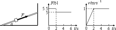 固定光滑細(xì)桿與地面成一定傾角,在桿上套有一個(gè)光滑小環(huán),小環(huán)在沿桿方向的推力F作用下向上運(yùn)動(dòng),推力F與小環(huán)速度v隨時(shí)間變化規(guī)律如圖所示,取重力加速度g=10 m/s2.求: