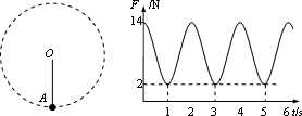 一根輕繩一端系一小球,另一端固定在O點(diǎn),在O點(diǎn)有一個(gè)能測(cè)量繩的拉力大小的力傳感器,讓小球繞O點(diǎn)在豎直平面內(nèi)做圓周運(yùn)動(dòng),由傳感器測(cè)出拉力F隨時(shí)間t變化圖像如圖所示,已知小球在最低點(diǎn)A的速度vA=6 m/s,求: