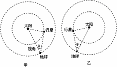 地球和某行星在同一軌道平面內(nèi)同向繞太陽做勻速圓周運動.地球的軌道半徑為R=1.50×1011 m,運轉(zhuǎn)周期為T=3.16×107 s.地球和太陽中心的連線與地球和行星的連線所夾的角叫地球?qū)υ撔行堑挠^察視角(簡稱視角).當行星處于最大視角處時,是地球上的天文愛好者觀察該行星的最佳時期,如圖甲或圖乙所示,該行星的最大視角