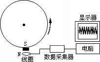 某同學(xué)設(shè)計了一個利用線圈測量轉(zhuǎn)輪轉(zhuǎn)速的裝置.如圖所示,在輪子的邊緣貼上小磁體,將小線圈靠近輪邊放置,接上數(shù)據(jù)采集器和電腦(即DIS實驗器材).如果小線圈的面積為S,圈數(shù)為N匝,小磁體附近的磁感應(yīng)強度最大值為B,回路的總電阻為R,實驗發(fā)現(xiàn),輪子轉(zhuǎn)過