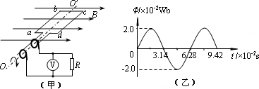 ,線圈的兩端經(jīng)集流環(huán)與電阻R連接,電阻R=90 Ω,與R并聯(lián)的交流電壓表為理想電表在t=0時(shí)刻,線圈平面與磁場(chǎng)方向平行,穿過(guò)每匝線圈的磁通量Φ隨時(shí)間t按圖(乙)所示正弦規(guī)律變化