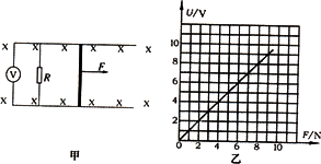 L,一端通過導(dǎo)線與阻值R的電阻連接,導(dǎo)軌上放一質(zhì)量為m的金屬桿(見圖甲),導(dǎo)軌的電阻忽略不計(jì),勻強(qiáng)磁場(chǎng)方向豎直向下,用與平軌平行的恒定拉力F作用在金屬桿上,金屬桿從靜止開始運(yùn)動(dòng),電壓表的讀數(shù)發(fā)生變化,但最終將會(huì)保持某一數(shù)值U恒定不變;當(dāng)作用在金屬桿上的拉力變?yōu)榱硪粋(gè)恒定值時(shí),電壓表的讀數(shù)最終相應(yīng)地會(huì)保持另一個(gè)恒定值不變,U與F的關(guān)系如圖乙.若m=0.5 kg,L=0.5 m,R=0.5 Ω,金屬桿的電阻r=0.5 Ω.(重力加速度g=10 m/s2)求:(1)磁感應(yīng)強(qiáng)度B;
