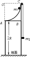 R的1/4圓弧支架豎直放置,支架底AB離地的距離為2 R,圓弧邊緣C處有一小定滑輪,一輕繩兩端系著質(zhì)量分別為m1與m2的物體,掛在定滑輪兩邊,且m1>m2,開始時(shí)m1、m2均靜止,m1、m2可視為質(zhì)點(diǎn),不計(jì)一切摩擦.求:(1)m1釋放后經(jīng)過圓弧最低點(diǎn)A時(shí)的速度;