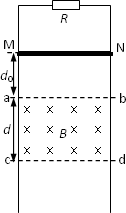 如圖所示,兩根豎直平行放置的光滑金屬導(dǎo)軌相距為L,中間接有一阻值為R的定值電阻,在兩導(dǎo)軌間abdc矩形區(qū)域內(nèi)分布有磁感應(yīng)強(qiáng)度為B的勻強(qiáng)磁場(chǎng),磁場(chǎng)方向垂直導(dǎo)軌平面向里,寬度為d.一質(zhì)量為m,電阻為r的導(dǎo)體棒MN垂直擱在導(dǎo)軌上,與磁場(chǎng)上邊邊界相距d0.現(xiàn)使棒MN由靜止開始釋放,當(dāng)MN最終離開磁場(chǎng)前已開始做勻速直線運(yùn)動(dòng),導(dǎo)軌電阻不計(jì),棒下落過(guò)程中始終保持水平,并與導(dǎo)軌接觸良好.