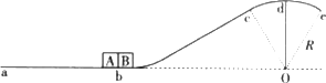 如圖所示,一條軌道固定在豎直平面內,粗糙的ab段水平,bcde段光滑,cde段是以O為圓心、R為半徑的一小段圓。梢暈橘|點的物塊A和B緊靠在一起,靜止于b處,A的質量是B的3倍.兩物塊在足夠大的內力作用下突然分離,分別向左、右始終沿軌道運動.B到d點時速度沿水平方向,此時軌道對B的支持力大小等于B所受重力的3/4,A與ab段的動摩擦因數(shù)為μ,重力加速度g,求:
