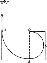 如圖所示,ABDO是處于豎直平面內(nèi)的光滑軌道,AB是半徑為R=15 m的1/4圓周軌道,半徑OA處于水平位置,BDO是直徑為15 m的半圓軌道,D為BDO軌道的中央.一個小球P從A點的正上方距水平半徑OA高H處自由落下,沿豎直平面內(nèi)的軌道通過D點時對軌道的壓力等于其重力的