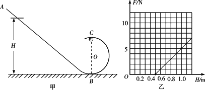 在半徑R=5000 km的某星球表面,宇航員做了如下實驗,實驗裝置如下圖甲所示.豎直平面內(nèi)的光滑軌道由軌道AB和圓弧軌道BC組成,將質(zhì)量m=0.2 kg的小球,從軌道AB上高H處的某點靜止滑下,用力傳感器測出小球經(jīng)過C點時對軌道的壓力F,改變H的大小,可測出相應(yīng)的F大小,F(xiàn)隨H的變化關(guān)系如圖乙所示,求:?
