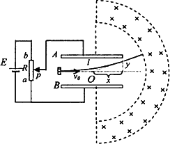 如圖所示,兩平行金屬板A、B長度為l,直流電源能提供的最大電壓為U,位于極板左側中央的粒子源可以沿水平方向向右連續(xù)發(fā)射質量為m、電荷量為-q、重力不計的帶電粒子,射入板間的粒子速度均為v0.在極板右側有一個垂直紙面向里的勻強磁場,磁感應強度為B,分布在環(huán)帶區(qū)域中,該環(huán)帶的內外圓的圓心與兩板問的中心重合于O點,環(huán)帶的內圓半徑為R1.當變阻器滑動觸頭滑至b點時,帶電粒子恰能從右側極板邊緣射向右側磁場.