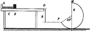 如圖所示,水平桌面上有一輕彈簧,左端固定在A點(diǎn),自然狀態(tài)時(shí)其右端位于B點(diǎn).D點(diǎn)位于水桌面最右端,水平桌面右側(cè)有一豎直放置的光滑軌道MNP,其形狀為半徑R=0.8 m的圓環(huán)剪去了左上角135°的圓弧,MN為其豎直直徑,P點(diǎn)到桌面的豎直距離為R,P點(diǎn)到桌面右側(cè)邊緣的水平距離為2R.用質(zhì)量m1=0.4 kg的物塊將彈簧緩慢壓縮到C點(diǎn),釋放后彈簧恢復(fù)原長(zhǎng)時(shí)物塊恰停止在B點(diǎn).用同種材料、質(zhì)量為m2=0.2 kg的物塊將彈簧緩慢壓縮到C點(diǎn)釋放,物塊過(guò)B點(diǎn)后其位移與時(shí)間的關(guān)系為x=6t-2t2,物塊從D點(diǎn)飛離桌面后恰好由P點(diǎn)沿切線落入圓軌道.g=10 m/s2,求: