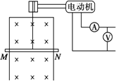 如圖所示,電動機牽引一根原來靜止的、長L為1 m、質(zhì)量m為0.1 kg的導(dǎo)體棒MN上升,導(dǎo)體棒的電阻R為1 Ω,架在豎直放置的框架上,它們處于磁感應(yīng)強度B為1 T的勻強磁場中,磁場方向與框架平面垂直.當導(dǎo)體棒上升h=3.8 m時,獲得穩(wěn)定的速度,導(dǎo)體棒上產(chǎn)生的熱量為2 J,電動機牽引棒時,電壓表、電流表的讀數(shù)分別為7 V、1 A,電動機內(nèi)阻r為1 Ω,不計框架電阻及一切摩擦,求