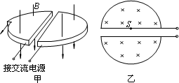 在高能物理研究中,粒子加速器起著重要作用,而早期的加速器只能使帶電粒子在高壓電場(chǎng)中加速一次,因而粒子所能達(dá)到的能量受到高壓技術(shù)的限制.1930年,Earnest O.Lawrence提出了回旋加速器的理論,他設(shè)想用磁場(chǎng)使帶電粒子沿圓弧形軌道旋轉(zhuǎn),多次反復(fù)地通過高頻加速電場(chǎng),直至達(dá)到高能量.下圖甲為Earnest O.Lawrence設(shè)計(jì)的回旋加速器的示意圖.它由兩個(gè)鋁制D型金屬扁盒組成,兩個(gè)D形盒正中間開有一條狹縫;兩個(gè)D型盒處在勻強(qiáng)磁場(chǎng)中并接有高頻交變電壓.下圖乙為俯視圖,在D型盒上半面中心S處有一正離子源,它發(fā)出的正離子,經(jīng)狹縫電壓加速后,進(jìn)入D型盒中.在磁場(chǎng)力的作用下運(yùn)動(dòng)半周,再經(jīng)狹縫電壓加速;為保證粒子每次經(jīng)過狹縫都被加速,應(yīng)設(shè)法使交變電壓的周期與粒子在狹縫及磁場(chǎng)中運(yùn)動(dòng)的周期一致.如此周而復(fù)始,最后到達(dá)D型盒的邊緣,獲得最大速度后被束流提取裝置提取出.已知正離子的電荷量為q,質(zhì)量為m,加速時(shí)電極間電壓大小恒為U,磁場(chǎng)的磁感應(yīng)強(qiáng)度為B,D型盒的半徑為R,狹縫之間的距離為d.設(shè)正離子從離子源出發(fā)時(shí)的初速度為零.