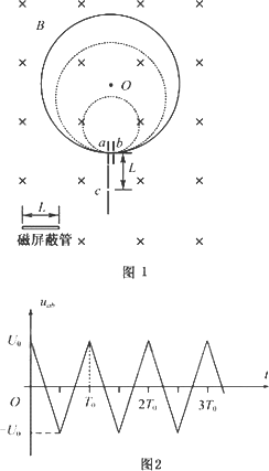 (2)現(xiàn)要利用一根長(zhǎng)為L(zhǎng)的磁屏蔽管(磁屏蔽管置于磁場(chǎng)中時(shí)管內(nèi)無(wú)磁場(chǎng),忽略其對(duì)關(guān)外磁場(chǎng)的影響)使圖1中實(shí)線軌跡(圓心為O)上運(yùn)動(dòng)的粒子從a孔正下方相距L處的c孔水平射出,請(qǐng)?jiān)诖痤}卡圖上的相應(yīng)位置處畫(huà)出磁屏蔽管;