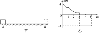 如圖甲所示,一質(zhì)量為m=1 kg的物塊靜止在粗糙水平面上的A點,從t=0時刻開始,物塊在按如圖乙所示規(guī)律變化的水平力F的作用下向右運動,第3 s末物塊運動到B點且速度剛好為0,第5 s末物塊剛好回到A點,已知物塊與粗糙水平面間的動摩擦因數(shù)μ=0.2,g取10 m/s2,求: