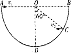 如圖所示,水平地面上有一個坑,其豎直截面為半圓,O為圓心,且B為沿水平方向的直徑.若在A點以初速度v1沿AB方向平拋一小球,小球?qū)糁锌颖谏系淖畹忘cD;而在C點以初速度v2沿BA方向平拋的小球也能擊中D點.已知∠COD=60°,求兩小球初速度之比v1∶v2.(小球視為質(zhì)點)