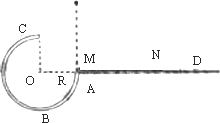 圓弧形光滑細圓管軌道ABC,放置在豎直平面內(nèi),軌道半徑為R,在A點與水平面AD相接,地面與圓心O等高,MN是放在水平地面上長為3 R、厚度不計的墊子,左端M正好位于A點,將一個質(zhì)量為m、直徑略小于圓管直徑的小球從A處管口正上方某處由靜止釋放,不考慮空氣阻力.