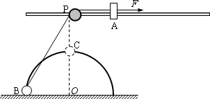 如圖所示,在距水平地面高為0.4 m處,水平固定一根長直光滑桿,桿上P處固定一定滑輪,滑輪可繞水平軸無摩擦轉(zhuǎn)動,在P點的右邊,桿上套一質(zhì)量m=3 kg的滑塊A.半徑R=0.3 m的光滑半圓形軌道豎直地固定在地面上,其圓心O在P點的正下方,在軌道上套有一質(zhì)量m=3 kg的小球B.用一條不可伸長的柔軟細繩,通過定滑輪將小球和滑塊連接起來.桿和半圓形軌道在同一豎直面內(nèi),滑塊和小球均可看作質(zhì)點,且不計滑輪大小的影響.現(xiàn)給滑塊A施加一個水平向右、大小為60N的恒力F,則: