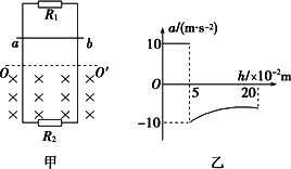 如圖甲所示,平行金屬導(dǎo)軌豎直放置,導(dǎo)軌間距為L(zhǎng)=1 m,上端接有電阻R1=3 Ω,下端接有電阻R2=6 Ω,虛線