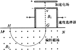 如圖所示為質譜儀的原理圖,電荷量為q、質量為m的帶正電的粒子從靜止開始經過電勢差為U的加速電場后,進入粒子速度選擇器,選擇器中存在相互垂直的勻強電場和勻強磁場,勻強電場的場強為E,方向水平向右.帶電粒子能夠沿直線穿過速度選擇器,從G點既垂直直線MN又垂直于磁場的方向射人偏轉磁場.偏轉磁場是一個以直線MN為邊界、方向垂直紙面向外的勻強磁場.帶電粒子經偏轉磁場后,最終達到照相底片的H點.已知偏轉磁場的磁感應強度為B2,帶電粒子的重力可忽略不計.求:
