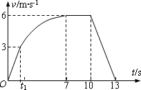 某探究性學(xué)習(xí)小組對一輛自制遙控車的性能進行研究.他們讓這輛小車在水平地面上由靜止開始運動,并將小車運動的全過程記錄下來,通過數(shù)據(jù)處理得到如圖所示的v-t圖像,已知小車在0~t1時間內(nèi)做勻加速直線運動,t1~10 s時間內(nèi)小車牽引力的功率保持不變,7 s末到達最大速度,在10 s末停止遙控讓小車自由滑行,小車質(zhì)量m=1 kg,整個過程中小車受到的阻力f大小不變.求: