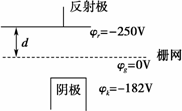 如圖所示裝置,真空中有三個電極:發(fā)射電子的陰極:其電勢φk=-182 V;柵網(wǎng):能讓電子由其間穿過,電勢φg=0;反射電板電勢為φr=-250 V.與柵網(wǎng)的距離d=4 mm.設(shè)各電極間的電場是均勻的,從陰極發(fā)射的電子初速度為零,電子所受重力可以忽略,已知電子質(zhì)量是0.9110-30 kg,電荷量e=1.610-19 C,設(shè)某時刻有一電子穿過柵網(wǎng)飛向反射極,問它經(jīng)過多少時間后再到柵網(wǎng)?