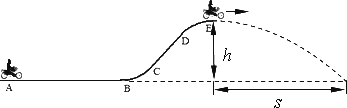 運動員駕駛摩托車做騰躍特技表演是一種刺激性很強的運動項目.如圖所示,AB是水平路面,BC是半徑為20 m的圓弧,CDE是一段曲面.運動員駕駛功率始終是P=1.8 kW的摩托車在AB段加速,到B點時速度達到最大vm=20 m/s,再經(jīng)t=13 s的時間通過坡面到達E點時,關(guān)閉發(fā)動機后水平飛出.已知人和車的總質(zhì)量m=180 kg,坡頂高度h=5 m,落地點與E點的水平距離s=16 m,重力加速度g=10 m/s2.如果在AB段摩托車所受的阻力恒定,求