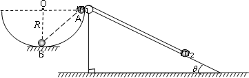 =30°.一根不可伸長的不計質(zhì)量的細繩跨在碗口及光滑斜面頂端的光滑定滑輪兩端上,線的兩端分別系有可視為質(zhì)點的小球m1和m2,且m1>m2.開始時m1恰在右端碗口水平直徑A處,m2在斜面上且距離斜面頂端足夠遠,此時連接兩球的細繩與斜面平行且恰好伸直.當m1由靜止釋放運動到圓心O的正下方B點時細繩突然斷開,不計細繩斷開瞬間的能量損失.