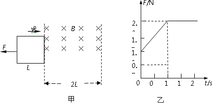 如圖甲所示,空間存在一寬度為2L有界勻強磁場,磁場方向垂直紙面向里.在光滑絕緣水平面內(nèi)有一邊長為L的正方形金屬線框,其質(zhì)量m=1 kg、電阻R=4 Ω,在水平向左的外力F作用下,以初速度v0=4 m/s勻減速進入磁場,線框平面與磁場垂直,外力F大小隨時間t變化的圖線如圖乙所示.以線框右邊剛進入磁場時開始計時,求: