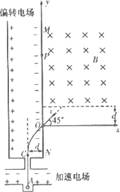 如圖所示,在xOy平面內(nèi),一帶正電的粒子自A點(diǎn)經(jīng)電場加速后從C點(diǎn)垂直射入偏轉(zhuǎn)電場(視為勻強(qiáng)電場),偏轉(zhuǎn)后通過極板MN上的小孔O離開電場,粒子在O點(diǎn)時(shí)的速度大小為v,方向與x軸成45°角斜向上,在y軸右側(cè)y≥d范圍內(nèi)有一個(gè)垂直紙面向里、磁感應(yīng)強(qiáng)度大小為B的勻強(qiáng)磁場,粒子經(jīng)過磁場偏轉(zhuǎn)后垂直打在極板MN上的P點(diǎn),已知NC之間距離為d,粒子重力不計(jì),求: