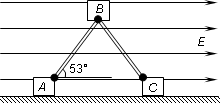 如圖,兩個(gè)長(zhǎng)均為L(zhǎng)的輕質(zhì)桿,通過A、B、C上垂直紙面的轉(zhuǎn)動(dòng)軸與A、B、C三個(gè)物塊相連,整體處于豎直面內(nèi).A、C為兩個(gè)完全相同的小物塊,B物塊的質(zhì)量與A小物塊的質(zhì)量之比為2∶1,三個(gè)物塊的大小都可忽略不計(jì).A、C兩物塊分別帶有+q、-q的電量,并置于絕緣水平面上,在水平面上方有水平向右的勻強(qiáng)電場(chǎng),場(chǎng)強(qiáng)為E,物塊間的庫(kù)侖力不計(jì).當(dāng)AB、BC與水平面間的夾角均為53°時(shí),整體恰好處于靜止?fàn)顟B(tài),一切摩擦均不計(jì),并且在運(yùn)動(dòng)過程中無內(nèi)能產(chǎn)生,重力加速度為g.(sin53°=0.8,cos53°=0.6)