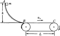 如圖所示,一質(zhì)量為m的滑塊從高為h的光滑圓弧形槽的頂端A處無(wú)初速度地滑下,槽的底端B與水平傳送帶相接,傳送帶的運(yùn)行速度為v0,長(zhǎng)為L(zhǎng),滑塊滑到傳送帶上后做勻加速運(yùn)動(dòng),滑到傳送帶右端C時(shí),恰好被加速到與傳送帶的速度相同.求: