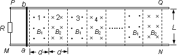 如圖所示,兩平行光滑的金屬導軌MN、PQ固定在水平面上,相距為L,處于豎直方向的磁場中,整個磁場由若干個寬度皆為d的條形勻強磁場區(qū)域1、2、3、4……組成,磁感應(yīng)強度B1、B2的方向相反,大小相等,即B1=B2=B.導軌左端MP間接一電阻R,質(zhì)量為m、電阻為r的細導體棒ab垂直放置在導軌上,與導軌接觸良好,不計導軌的電阻.現(xiàn)對棒ab施加水平向右的拉力,使其從區(qū)域1磁場左邊界位置開始以速度v0向右作勻速直線運動并穿越n個磁場區(qū)域.