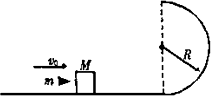 如圖所示,光滑半圓軌道豎直放置,半徑為R,一水平軌道與圓軌道相切,在水平光滑軌道上停著一個(gè)質(zhì)量為M=0.99 kg的木塊,一顆質(zhì)量為m=0.01 kg的子彈,以v0=400 m/s的水平速度射入木塊中,然后一起運(yùn)動(dòng)到軌道最高點(diǎn)水平拋出,當(dāng)圓軌道半徑R多大時(shí),平拋的水平距離最大?最大值是多少?(g取10 m/s2)