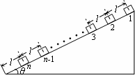 的斜面固定.有n個(gè)質(zhì)量都為m的相同的小木塊(可視為質(zhì)點(diǎn))放置在斜面上.相鄰兩小木塊間距離都為l,最下端的木塊距底端也是l,小木塊與斜面間的動(dòng)摩擦因數(shù)都為μ.在開始時(shí)刻,第一個(gè)小木塊從斜面頂端以初速度v0沿斜面下滑,其余所有木塊都靜止,由于第一個(gè)木塊的下滑將依次引起一系列的碰撞.設(shè)每次碰撞的時(shí)間極短,在每次碰撞后,發(fā)生碰撞的木塊都粘在一起運(yùn)動(dòng),直到最后第n個(gè)木塊到達(dá)底端時(shí),速度剛好為零.已知重力加速度為g.求: