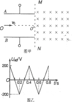如圖甲所示,兩平行金屬板間接有如圖乙所示的隨時間t變化的電壓UAB,兩板間電場可看做是均勻的,且兩板外無電場,極板長L=0.2 m,板間距離d=0.2 m,在金屬板右側(cè)有一邊界為MN的區(qū)域足夠大的勻強(qiáng)磁場,MN與兩板間中線OO′垂直,磁感應(yīng)強(qiáng)度B=5×l0-3 T,方向垂直紙面向里.現(xiàn)有帶正電的粒子流沿兩板中線OO′連續(xù)射入電場中,已知每個粒子的速度v0=105 m/s,比荷