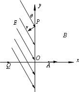 如圖所示,直角坐標(biāo)系在一真空區(qū)域里,y軸的左方有一勻強電場,場強方向跟y軸負(fù)方向成θ=30o角,y軸右方有一垂直于坐標(biāo)系平面的勻強磁場,在x軸上的A點有一質(zhì)子發(fā)射器,它向x軸的正方向發(fā)射速度大小為v=2.0×106 m/s的質(zhì)子,質(zhì)子經(jīng)磁場在y軸的P點射出磁場,射出方向恰垂直于電場的方向,質(zhì)子在電場中經(jīng)過一段時間,運動到x軸的Q點.已知A點與原點O的距離為10 cm,Q點與原點O的距離為(20