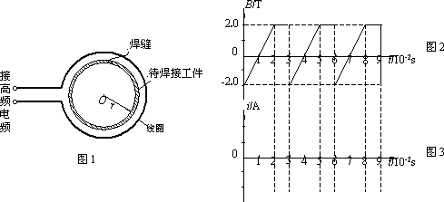 高頻焊接是一種常用的焊接方法,圖1是焊接的原理示意圖.將半徑為r=10 cm的待焊接的環(huán)形金屬工件放在線圈中,然后在線圈中通以高頻變化電流,線圈產生垂直于工件所在平面的勻強磁場,磁感應強度B隨時間t的變化規(guī)律如圖2所示,t=0時刻磁場方向垂直線圈所在平面向外.工件非焊接部分單位長度上的電阻R0=1.0×10-3 W × m-1,焊縫處的接觸電阻為工件非焊接部分電阻的9倍,焊接的縫寬非常小,不計溫度變化對電阻的影響.