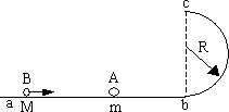 如圖所示,abc是光滑的軌道,其中ab是水平的,bc為豎直平面內(nèi)的半圓且與ab相切,徑R=0.3 m.質(zhì)量m=0.5 kg的小球A靜止在軌道上,另一個(gè)質(zhì)量M=1.0 kg的小球B,以速度v0=6.5 m/s與小球A正碰.已知碰撞后小球A經(jīng)過(guò)半圓的最高點(diǎn)c落到軌道上距b點(diǎn)為L(zhǎng)=4