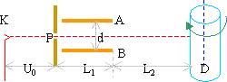 如圖所示,從陰極K射出的電子經(jīng)U0=5000 V的電勢(shì)差加速后,沿平行于板面的方向從中央射入兩塊長(zhǎng)L1=10 cm,間距d=4 cm的平行金屬板AB之間.在離金屬板邊緣L2=75 cm處放置一個(gè)直徑D=20 cm,帶有記錄紙的圓筒.整個(gè)裝置放在真空內(nèi),電子發(fā)射的初速度不計(jì).