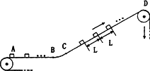 [理綜]一傳送帶裝置示意如下圖,其中傳送帶經(jīng)過AB區(qū)域時是水平的,經(jīng)過BC區(qū)域時變?yōu)閳A弧形(圓弧由光滑模板形成,未畫出),經(jīng)過CD區(qū)域時是傾斜的,AB和CD都與BC相切.現(xiàn)將大量的質(zhì)量均為m的小貨箱一個一個在A處放到傳送帶上,放置時初速為零,經(jīng)傳送帶運送到D處,D和A的高度差為h.穩(wěn)定工作時傳送帶速度不變,CD段上各箱等距排列,相鄰兩箱的距離為L.每個箱子在A處投放后,在到達B之前已經(jīng)相對于傳送帶靜止,且以后也不再滑動(忽略經(jīng)BC段時的微小滑動).已知在一段相當(dāng)長的時間T內(nèi),共運送小貨箱的數(shù)目為N.這裝置由電動機帶電,傳送帶與輪子間無相對滑動,不計輪軸處的摩擦.求電動機的平均輸出功率
