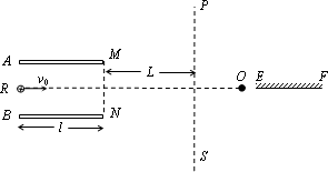如圖所示,兩平行金屬板A、B長l=8 cm,兩板間距離d=8 cm,A板比B板電勢高300 V,即UAB=300 V.一帶正電的粒子電量q=10-10 C,質量m=10-20 kg,從R點沿電場中心線垂直電場線飛入電場,初速度v0=2×106 m/s,粒子飛出平行板電場后經(jīng)過界面MN、PS間的無電場區(qū)域后,進入固定在中心線上的O點的點電荷Q形成的電場區(qū)域(設界面PS右邊點電荷的電場分布不受界面的影響).已知兩界面MN、PS相距為L=12 cm,粒子穿過界面PS最后垂直打在放置于中心線上的熒光屏EF上.(靜電力常數(shù)k=9×109 N·m2/C2)