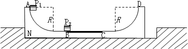 U形滑板N,滑板兩端為半徑R=0.45 m的1/4圓弧面,A和D分別是圓弧的端點(diǎn),BC段表面粗糙,其余段表面光滑.小滑塊P1和P2的質(zhì)量均為m,滑板的質(zhì)量M=4m.P1和P2與BC面的動(dòng)摩擦因數(shù)分別為μ1=0.10和μ2=0.40,最大靜摩擦力近似等于滑動(dòng)摩擦力.開(kāi)始時(shí)滑板緊靠槽的左端,P2靜止在粗糙面的B點(diǎn).P1以v0=4.0 m/s的初速度從A點(diǎn)沿弧面自由滑下,與P2發(fā)生彈性碰撞后,P1處在粗糙面B點(diǎn)上.當(dāng)P2滑到C點(diǎn)時(shí),滑板恰好與槽的右端碰撞并牢固粘連,P2繼續(xù)滑動(dòng),到達(dá)D點(diǎn)時(shí)速度為零.P1與P2視為質(zhì)點(diǎn),取g=10 m/s2,問(wèn):(1)P1在BC段向右滑動(dòng)時(shí),滑板的加速度為多大?