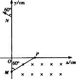 如圖所示,第四象限內(nèi)有互相正交的勻強(qiáng)電場E與勻強(qiáng)磁場B1,勻強(qiáng)電場E的電場強(qiáng)度大小為E=500 V/m,勻強(qiáng)磁場B1的磁感應(yīng)強(qiáng)度大小B1=0.5 T.第一象限的某個區(qū)域內(nèi),有方向垂直紙面向里的勻強(qiáng)磁場B2,磁場的下邊界與x軸重合.一質(zhì)量m=1×10-14 kg、電荷量q=1×10-10 C的帶正電微粒以某一速度v沿與y軸正方向成60°角從M點沿直線,經(jīng)P點進(jìn)入處于第一象限內(nèi)的矩形勻強(qiáng)磁場B2區(qū)域.一段時間后,微粒經(jīng)過y軸上的N點并與y軸正方向成60°角的方向飛出.M點的坐標(biāo)為(0,-10),N點的坐標(biāo)為(0,30),不計微粒的重力,g取10 m/s2.