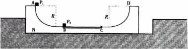 U形滑板N,滑板兩端為半徑R=0.45 m的1/4圓弧而,A和D分別是圓弧的端點,BC段表面粗糙,其余段表面光滑,小滑塊P1和P2的質(zhì)量均為m,滑板的質(zhì)量M=4 m.P1和P2與BC面的動摩擦因數(shù)分別為μ1=0.10和μ2=0.40,最大靜摩擦力近似等于滑動摩擦力,開始時滑板緊靠槽的左端,P2靜止在粗糙面的B點,P1以v0=4.0 m/s的初速度從A點沿弧面自由滑下,與P2發(fā)生彈性碰撞后,P1處在粗糙面B點上,當(dāng)P2滑到C點時,滑板恰好與槽的右端碰撞并與槽牢固粘連,P2繼續(xù)滑動,到達(dá)D點時速度為零,P1與P2視為質(zhì)點,取g=10 m/s2.問:(1)P2在BC段向右滑動時,滑板的加速度為多大?